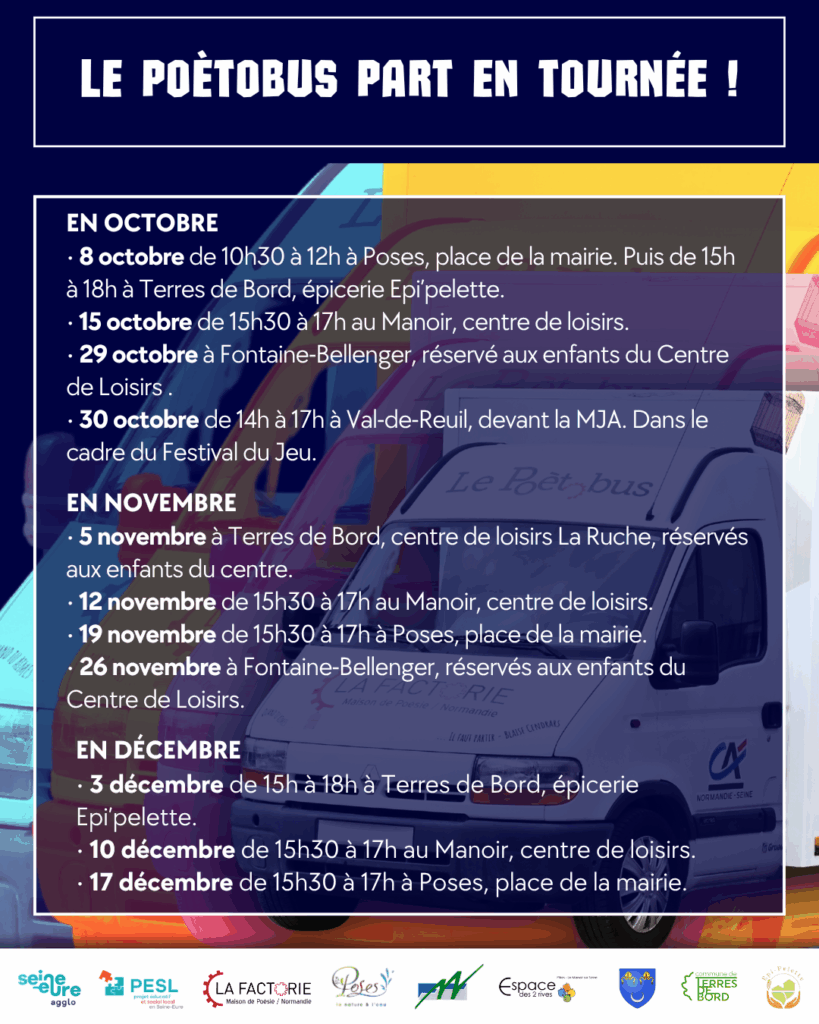 A l’initiative de Julie Le Meur, et grâce au soutien de partenaires et de mécènes éclairés, notre rêve de Poètobus devient aujourd’hui réalité. Il permettra d’emmener la poésie dans toutes les communes rurales, les quartiers prioritaires et les établissements de soins normands qui le souhaitent.