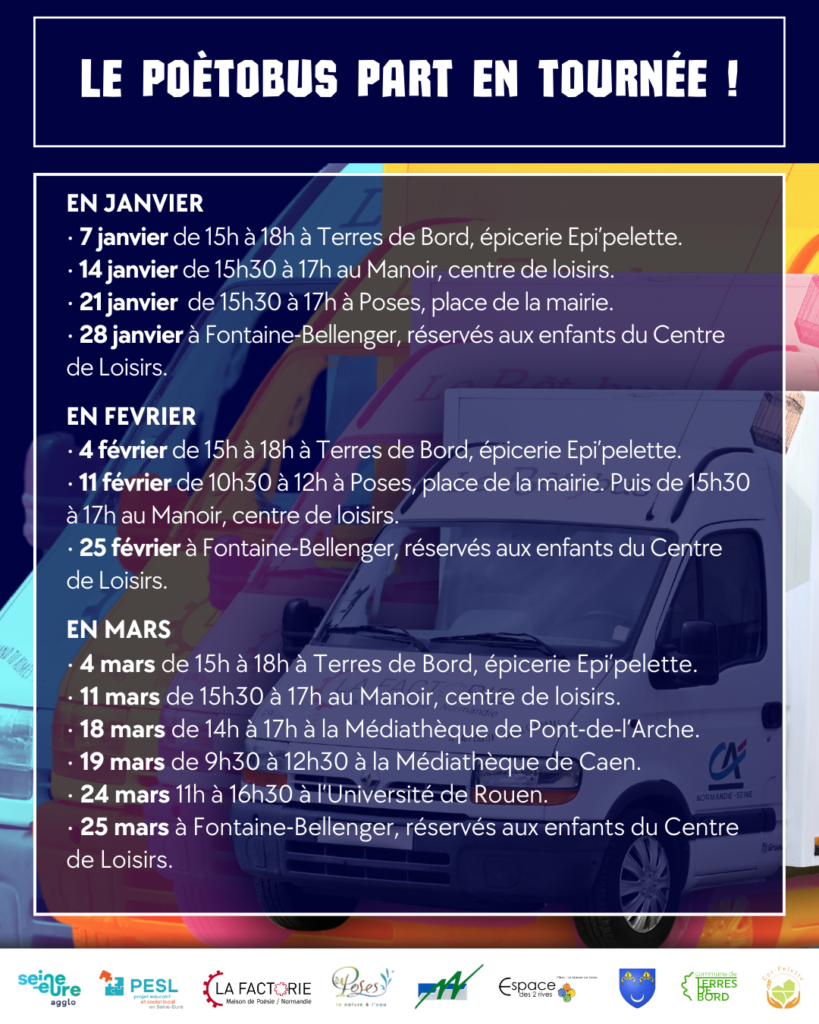 A l’initiative de Julie Le Meur, et grâce au soutien de partenaires et de mécènes éclairés, notre rêve de Poètobus devient aujourd’hui réalité. Il permettra d’emmener la poésie dans toutes les communes rurales, les quartiers prioritaires et les établissements de soins normands qui le souhaitent.