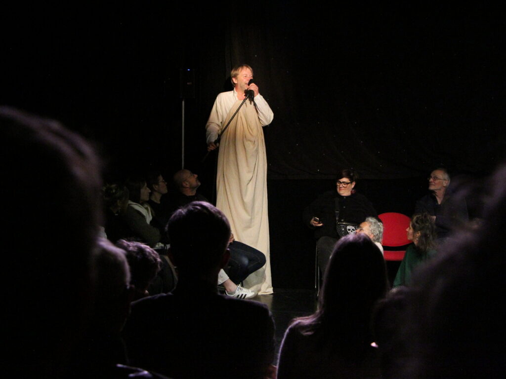 Entre poésie et musique électro, une expérience immersive centrée sur les mots dans une atmosphère mystérieuse, aérienne et vaporeuse.